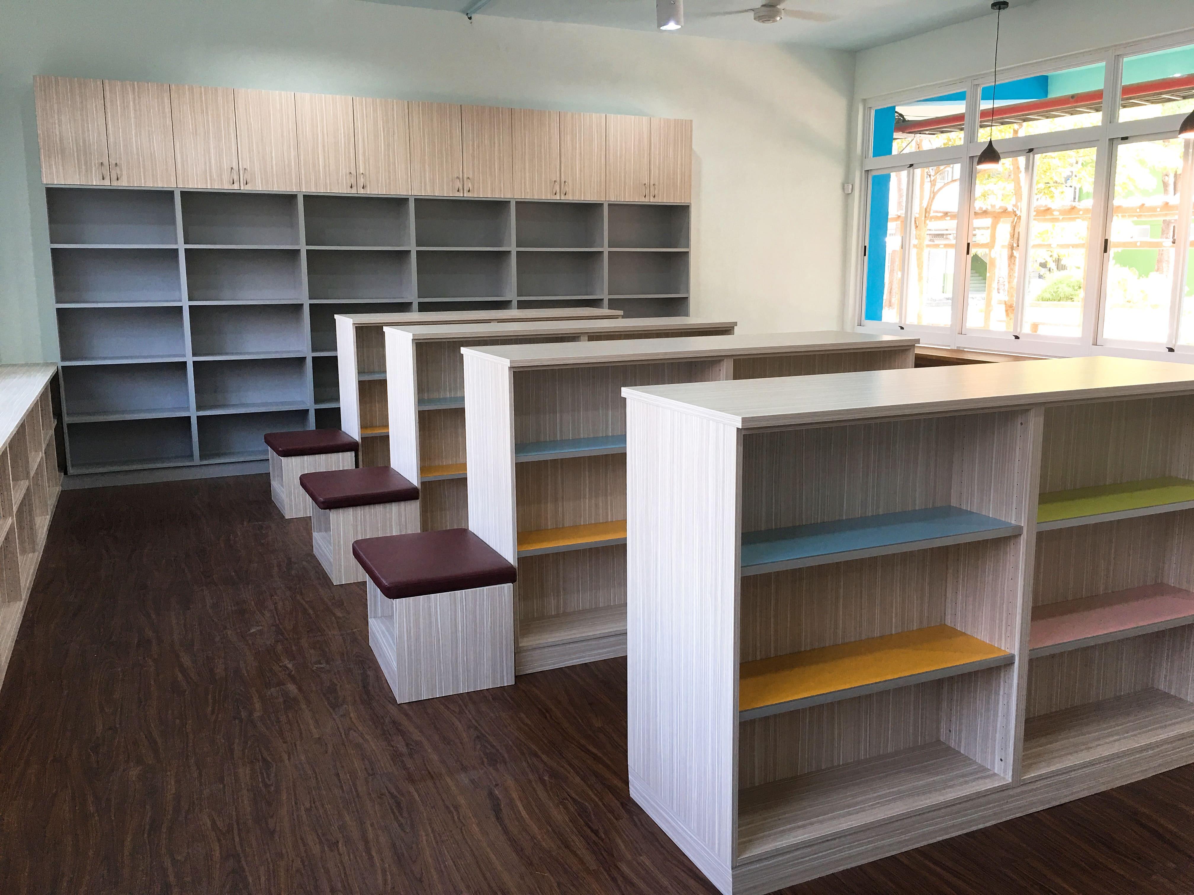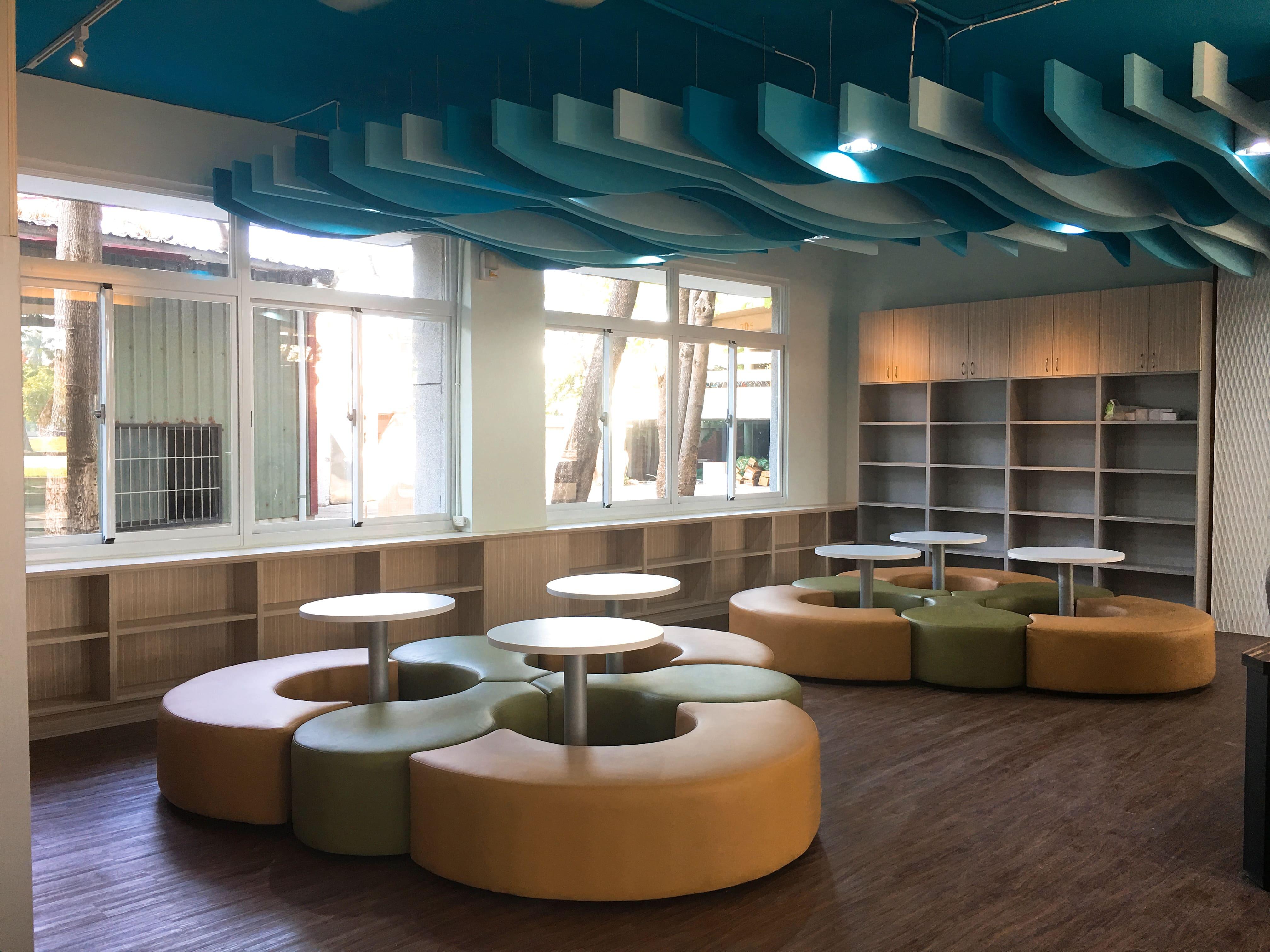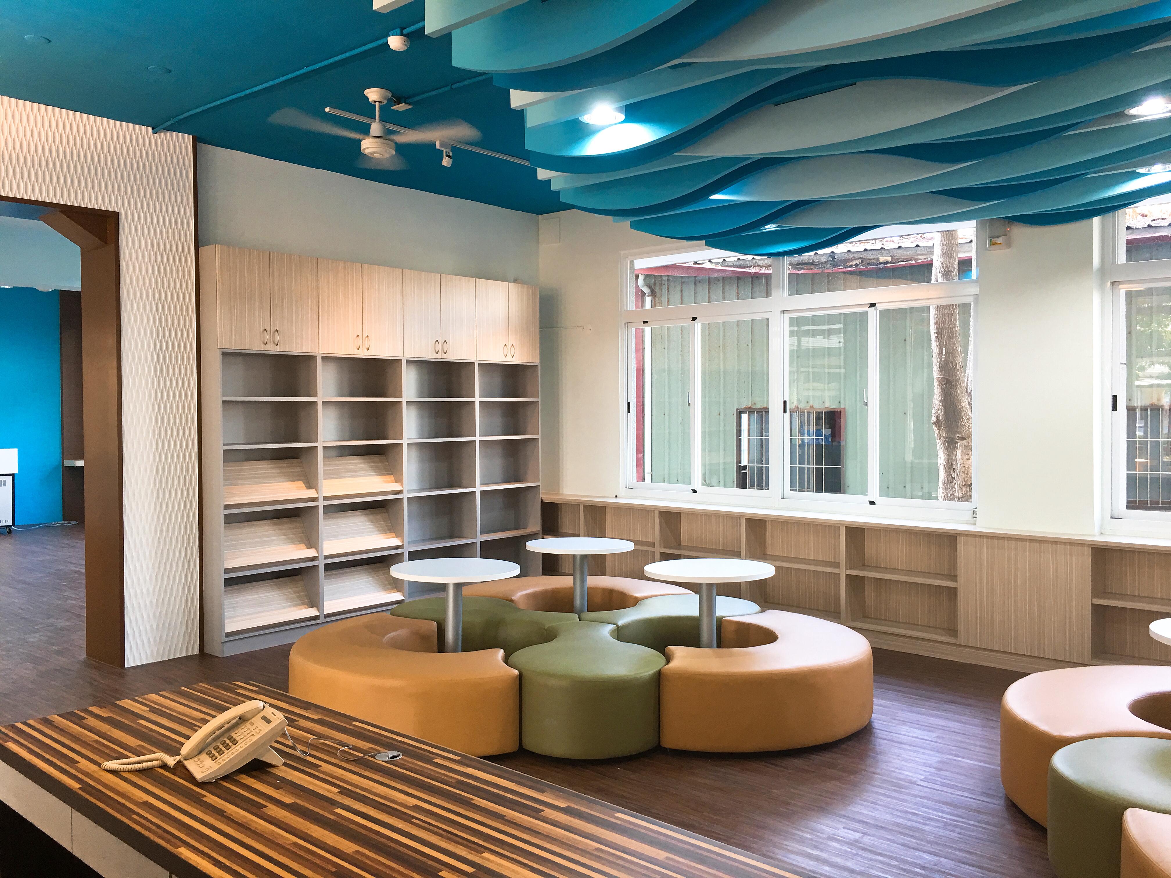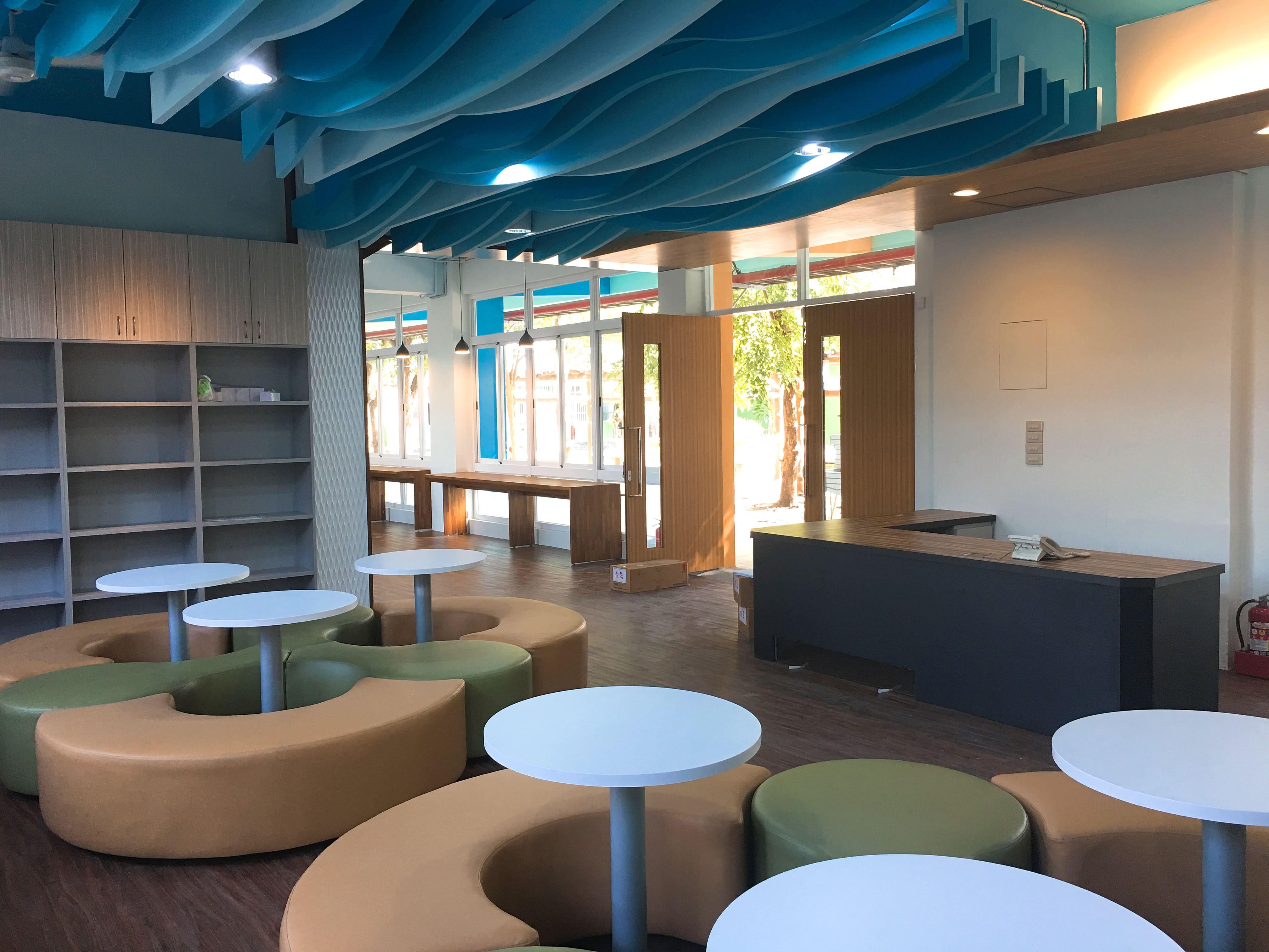 茄萣國中打造海洋中的書香空間,天花板映照著水中波浪的光影,彷彿置身蔚藍海底。閱讀在此成為沉靜而詩意的體驗,知識與自然交織,營造出如夢似幻的學習氛圍。